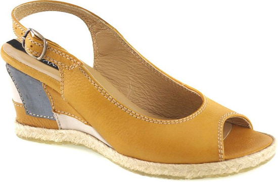 Sandały firmy An Mex. Wykonane ze skóry naturalnej licowej. Wkładka poprawiająca komfort użytkowania. Zapinane paskiem przy kostce na klamerkę. Pięta odkryta. Spód odlew obciągany skórą i wykończony plecionką przy podeszwie. Podeszwa z gumy z dodatkiem kauczuku. Pod palcami ok. 1 cm a pod piętą ok 7,5cm wysokości.